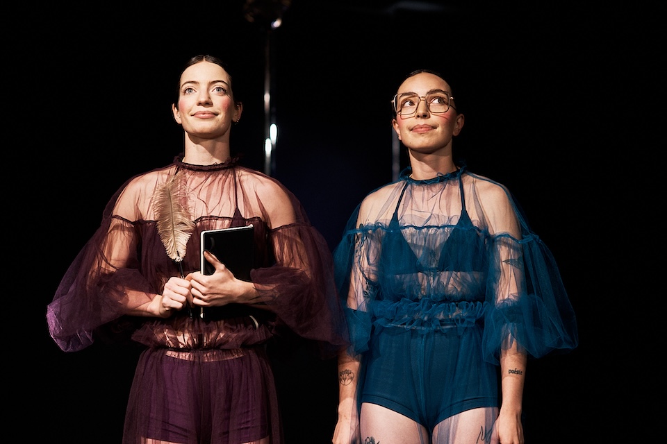« Que vaut-il mieux : prostituer son cul ou son âme ? » Voilà la question qui taraude l’une des deux étudiantes qui attendent la venue de Grisélidis Réal, qu’elles souhaitent interviewer sur le travail du sexe pour leur mémoire de fin d’études. Effet comique garanti, les deux étudiantes ont des personnalités à l’opposition exacerbée – l’une (Mathi Le Coultre), posée et réfléchie, habillée en violet, les pieds tournés en dehors ; l’autre (Margot Le Coultre), spontanée et volubile, habillée en bleu, les pieds en dedans. À la lumière d’un lampadaire, elles débattent, se questionnent, se disputent : « qu’est-ce qu’une pute ? » « Qu’est-ce qu’une femme ? ». Entre les silences de l’attente et les discussions, apparaissent des travailleuses du sexe à l’allure féerique, nommées prostitu-fées par les deux comédien·ne·x. Le réverbère se transforme alors en barre de pole dance, sur laquelle les prostitu-fées portent la parole de celle qui se faisait appeler la « marraine des putes » et « catin révolutionnaire ». Tandis que l’étudiante en bleu assouvit sa curiosité et voit un monde inconnu s’ouvrir à elle, celle en violet se confronte à ses a priori sur la question. C’est ainsi que les deux artistes parviennent à multiplier les points de vue, abordant les aspects crus du sujet tout en dépeignant un univers plus complexe qu’il n’y paraît, avec ses dimensions concrètes et capitalistiques autant que sociétales et artistiques. Une question reste plus que jamais contemporaine : quelle est la place du plaisir dans la sphère économique et comment aborder cette notion dans la discussion de société ? À cela s’ajoute une interrogation implicite et fondamentale à l’heure de l’ultracrépidarianisme – cette maladie actuelle qui sévit dans les médias en continu et sur les réseaux sociaux, et qui consiste à donner son avis ou à se prononcer avec autorité sur des sujets que l’on ne maîtrise pas : entre théorie et vécu, entre engagement et prise de parole, qui peut parler de quoi ? La connaissance suffit-elle à la compréhension ? Cette attente à la Godot, clairement revendiquée par Mathi et Margot Le Coultre, s’inscrit dans un langage scénique très riche, mêlant jeu, danse et pantomime sur un ton qui manie avec virtuosité humour, poésie des corps et des mots, et des moments plus sombres et empoignants.